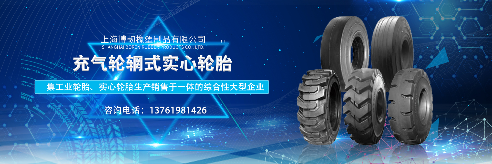 上海博韧橡塑制品有限公司 是集工业轮胎、实心轮胎生产销售于一体的综合性大型企业, 在同行中处于杰出地位。 公司与德国美国等顶级轮胎企业合作, 现生产销售从3 . 0 0 - 8到3 5 / 6 5 - 3 3的实心轮胎以及部分工业充气轮胎, 总计上百个品种。 产品的结构配方和花纹设计均经过科学的现场测试, 具有安全舒适性好, 承载力高, 耐磨性优, 使用寿命长等特点。
